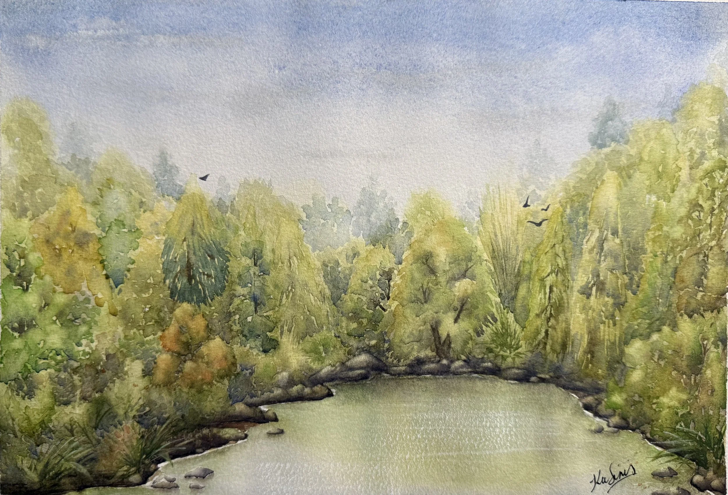 My paintings are an intuitive process; mostly I just let the paint and paper do its thing. I’m just the one holding the brush, responding to what is happening in front of me, in the moment. When I started this particular painting, I was aiming for something simple, i’m sitting here brush in hand, thinking about a ‘nice nature hike, and a pretty little waterhole with lots of trees’.... but that’s the thing about intuitive painting. If you’re in a place to allow the flow… not just of the watercolour, but of meaning; magic happens. I learned a lot about myself through this painting.